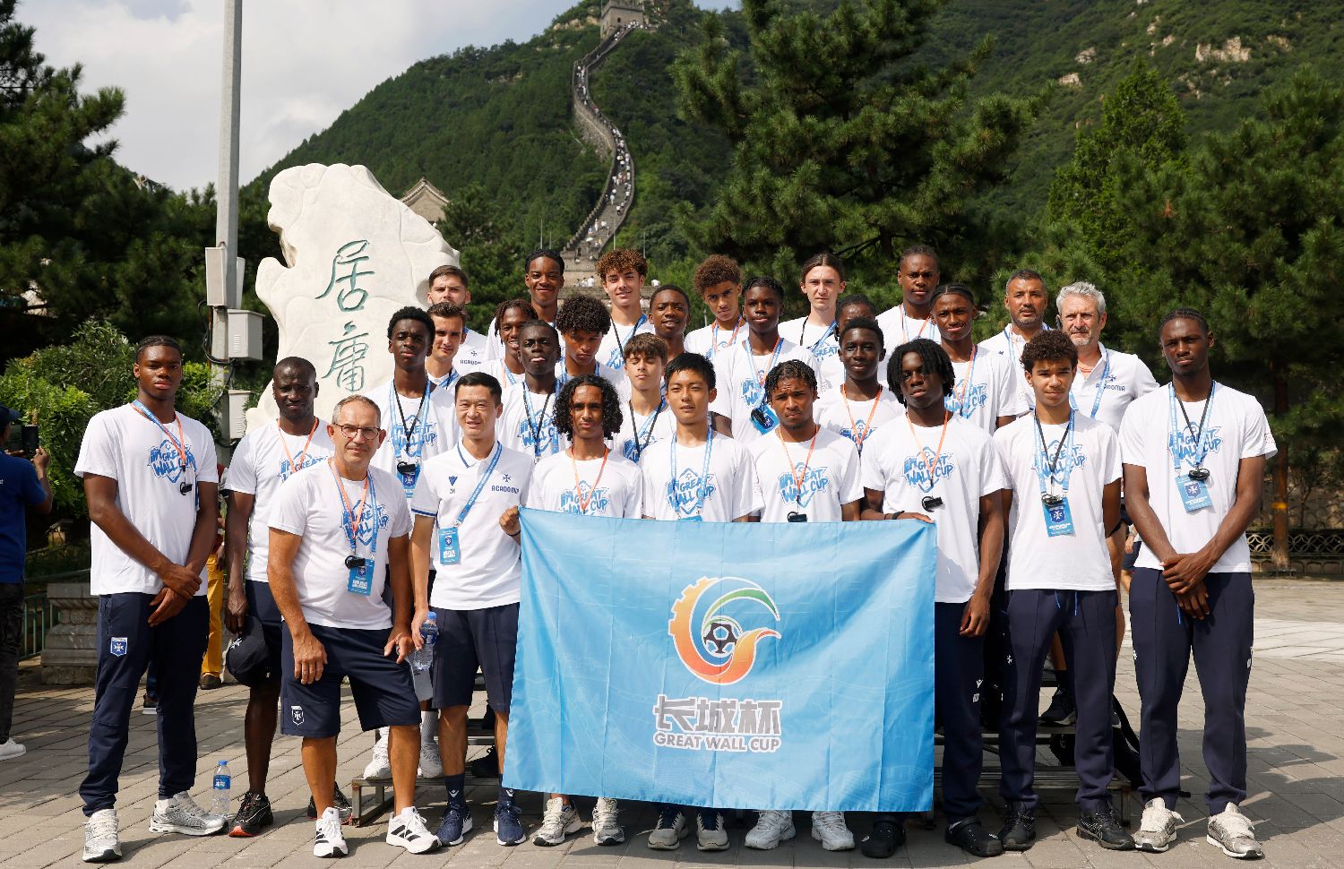 8月17日,法国欧塞尔俱乐部U16梯队教练团队与队员在北京居庸关长城合影。