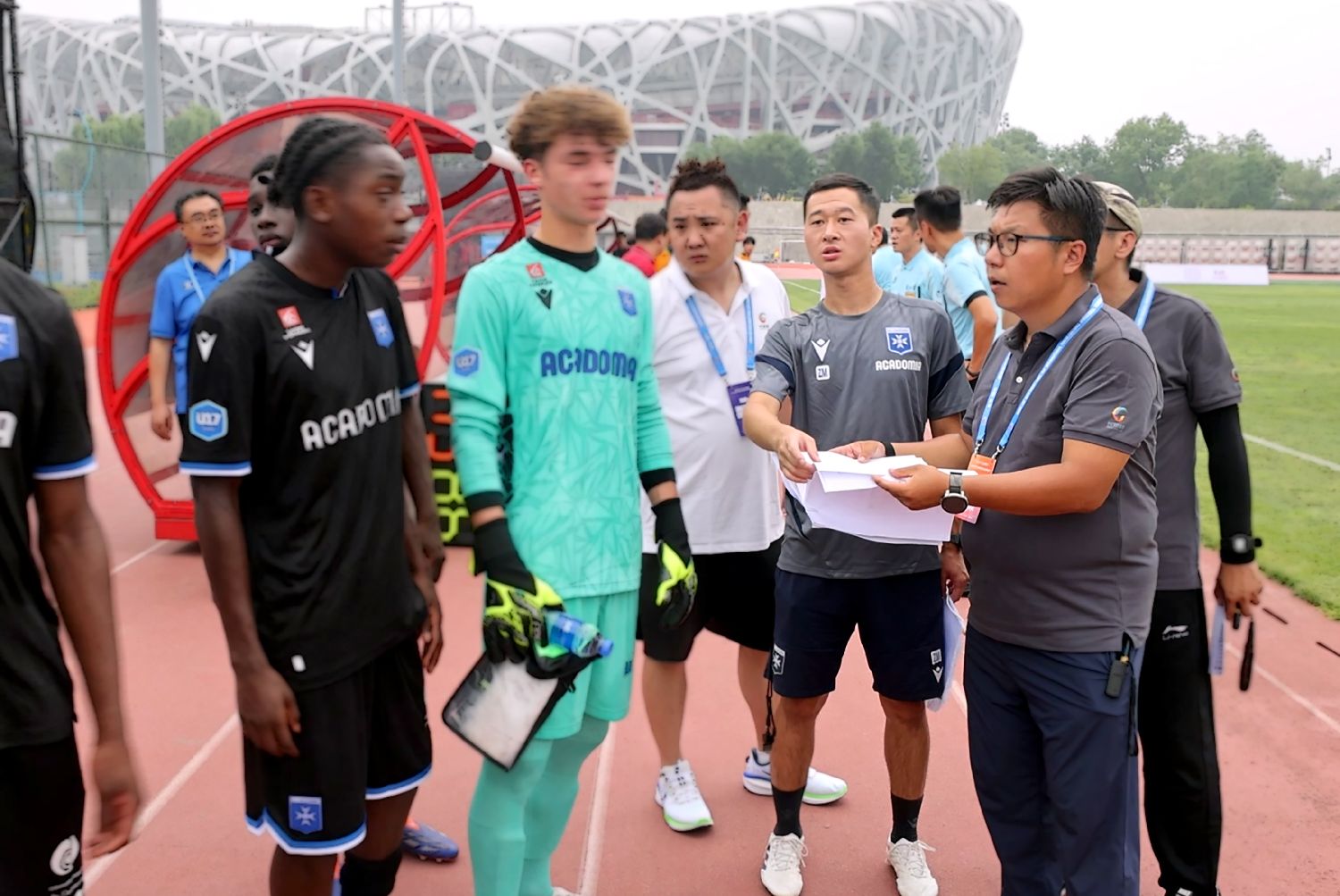 北京八月的午后,热浪裹挟着草皮蒸腾的气息,笼罩在北京国家体育场室外热身场上。法国欧塞尔俱乐部U18梯队主教练明智,此次以助教身份带领法国欧塞尔俱乐部U16梯队参加2025年第十届长城杯国际青少年足球邀请赛。