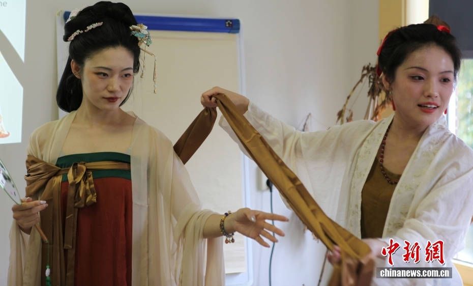 荷兰汉服社成员向听众讲解所穿的汉服。(图片来源:中新网)