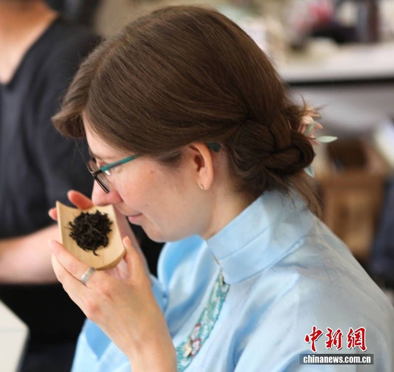 一名身穿汉服的听众品味茶香。(图片来源:中新网)