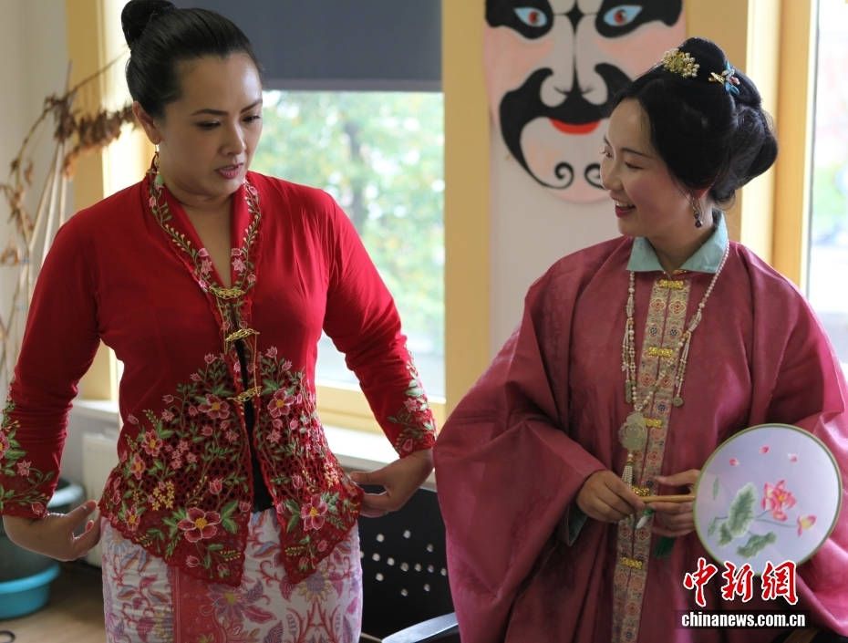 荷兰汉服社成员与一名听众交流各自服饰的特点。(图片来源:中新网)