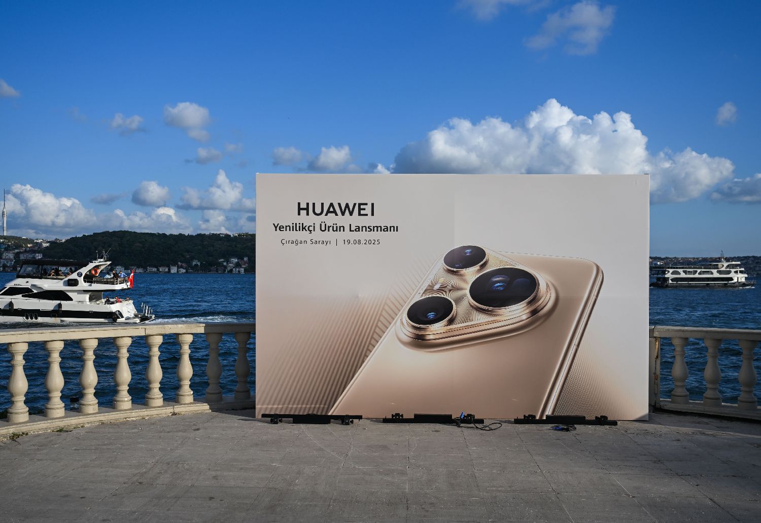 8月19日在土耳其伊斯坦布尔博斯普鲁斯海峡边拍摄的华为产品海报。
