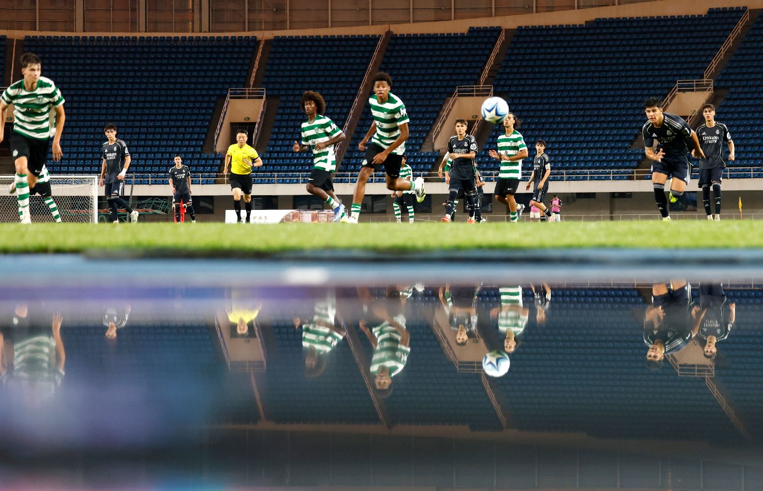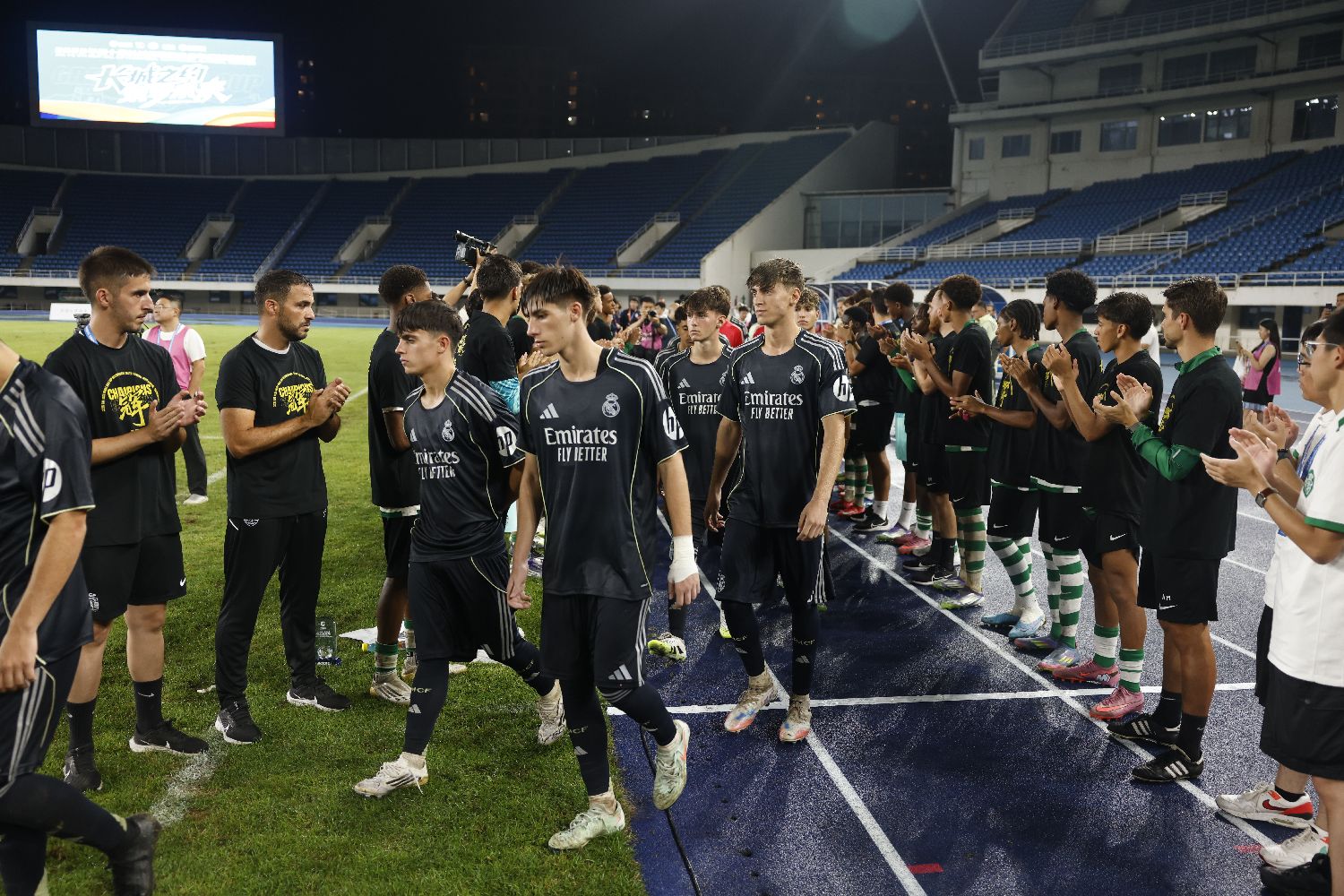 北京时间2025年8月19日,颁奖仪式现场,葡萄牙体育足球俱乐部U16队列队鼓掌欢迎西班牙皇家马德里U16队球员登台领奖。