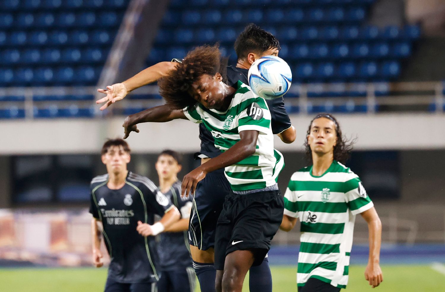 北京时间2025年8月19日,葡萄牙体育足球俱乐部U16队球员(绿白条纹)与西班牙皇家马德里U16队球员在决赛现场争抢。