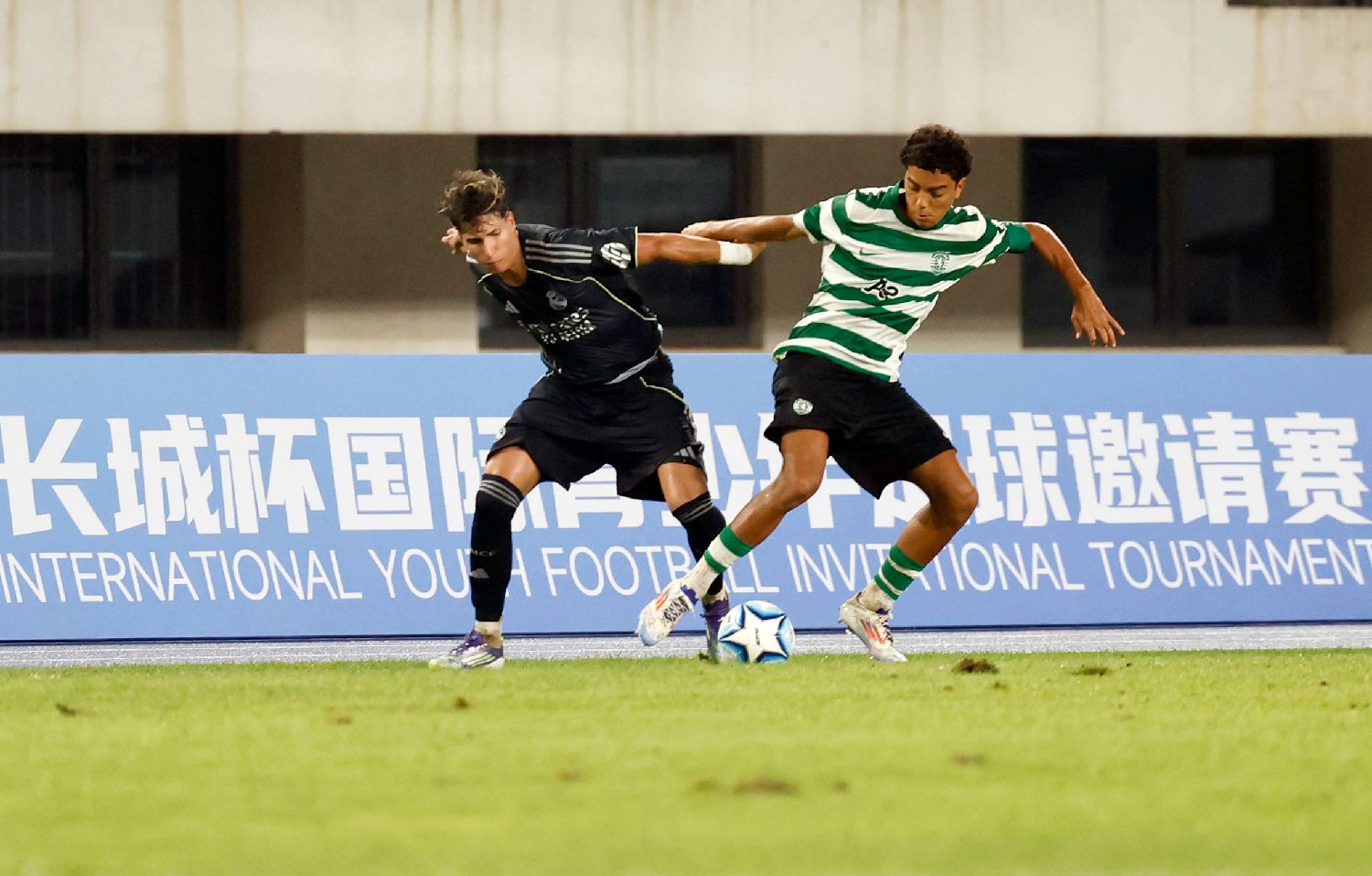 北京时间2025年8月19日,2025年第十届长城杯国际青少年足球邀请赛决赛中,葡萄牙体育足球俱乐部U16队(绿白条纹)与西班牙皇家马德里U16队在赛场上比拼。(图片来源:本文图片均自卞戈 摄)