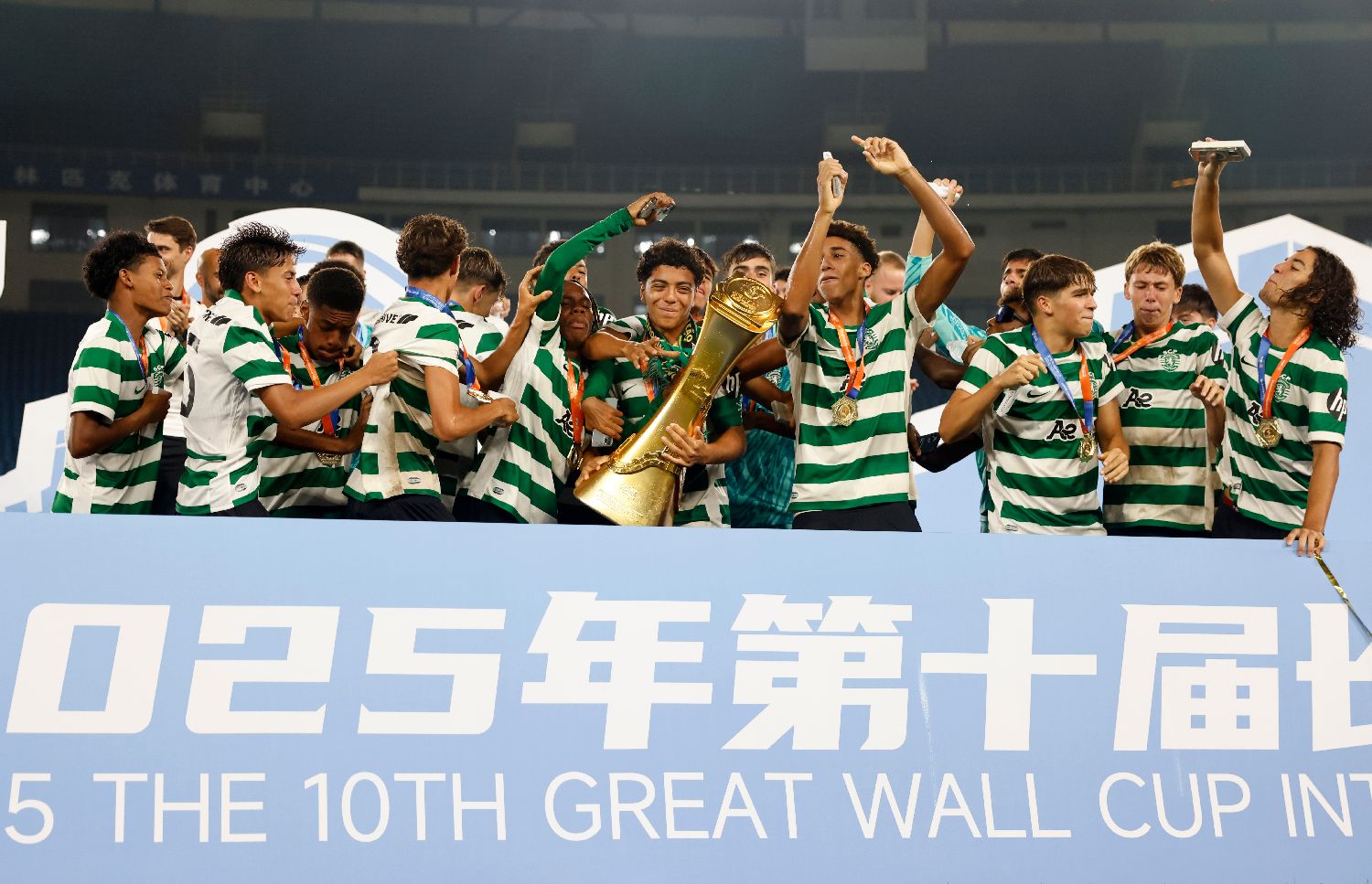 北京时间2025年8月19日,葡萄牙体育足球俱乐部U16队球员庆祝夺冠。当日,2025年第十届长城杯国际青少年足球邀请赛在北京的中国国家奥林匹克中心体育场落下帷幕。在当晚的决赛中,葡萄牙体育足球俱乐部U16队以3∶0战胜西班牙皇家马德里U16队,捧起冠军奖杯。