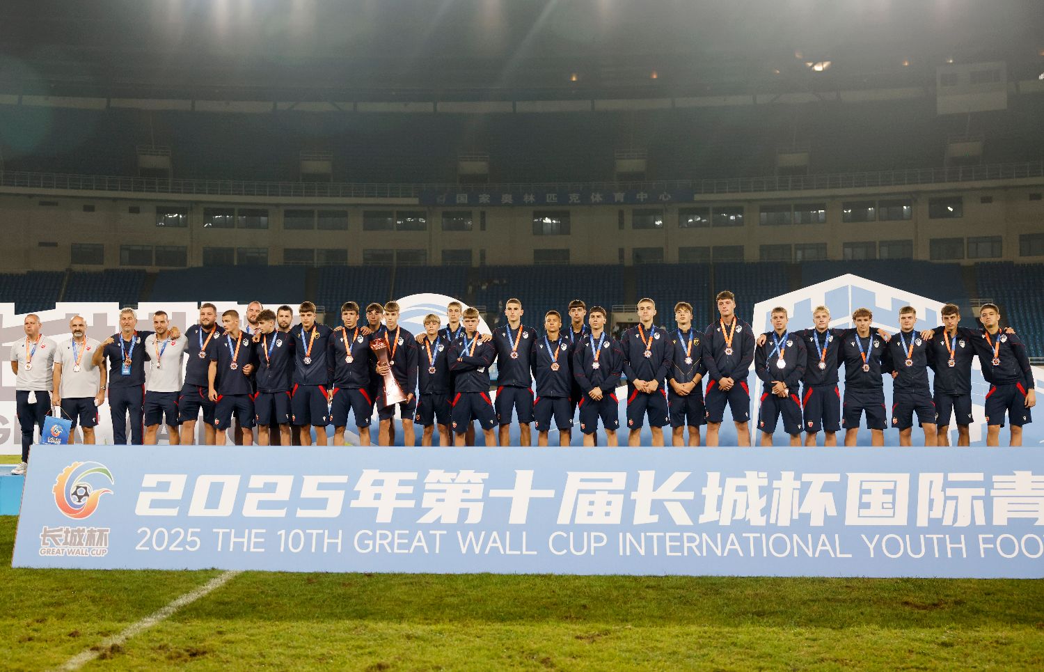 北京时间2025年8月19日,塞尔维亚贝尔格莱德红星足球俱乐部U16队教练及球员登台领取季军奖牌、奖杯,并留影。