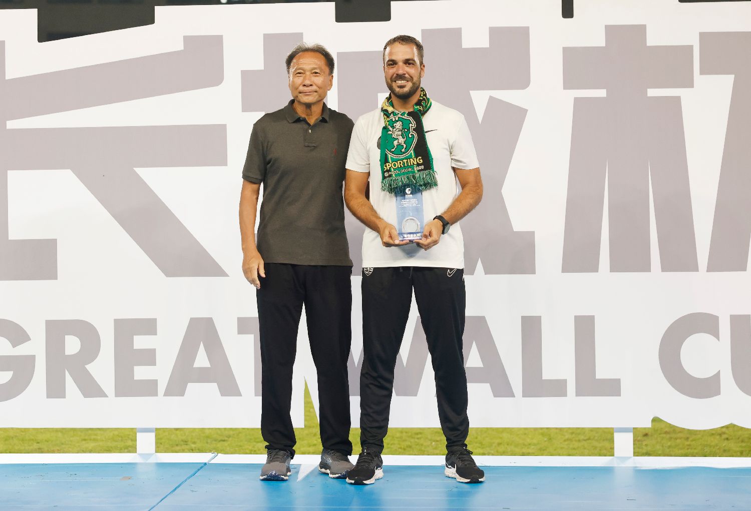 北京时间2025年8月19日,颁奖仪式现场,中国国奥队原主教练、中国足协技术委员会主任沈福祥为葡萄牙体育足球俱乐部U16队主教练佩德罗·庞特斯(右)颁发“最佳教练员”奖杯并合影。