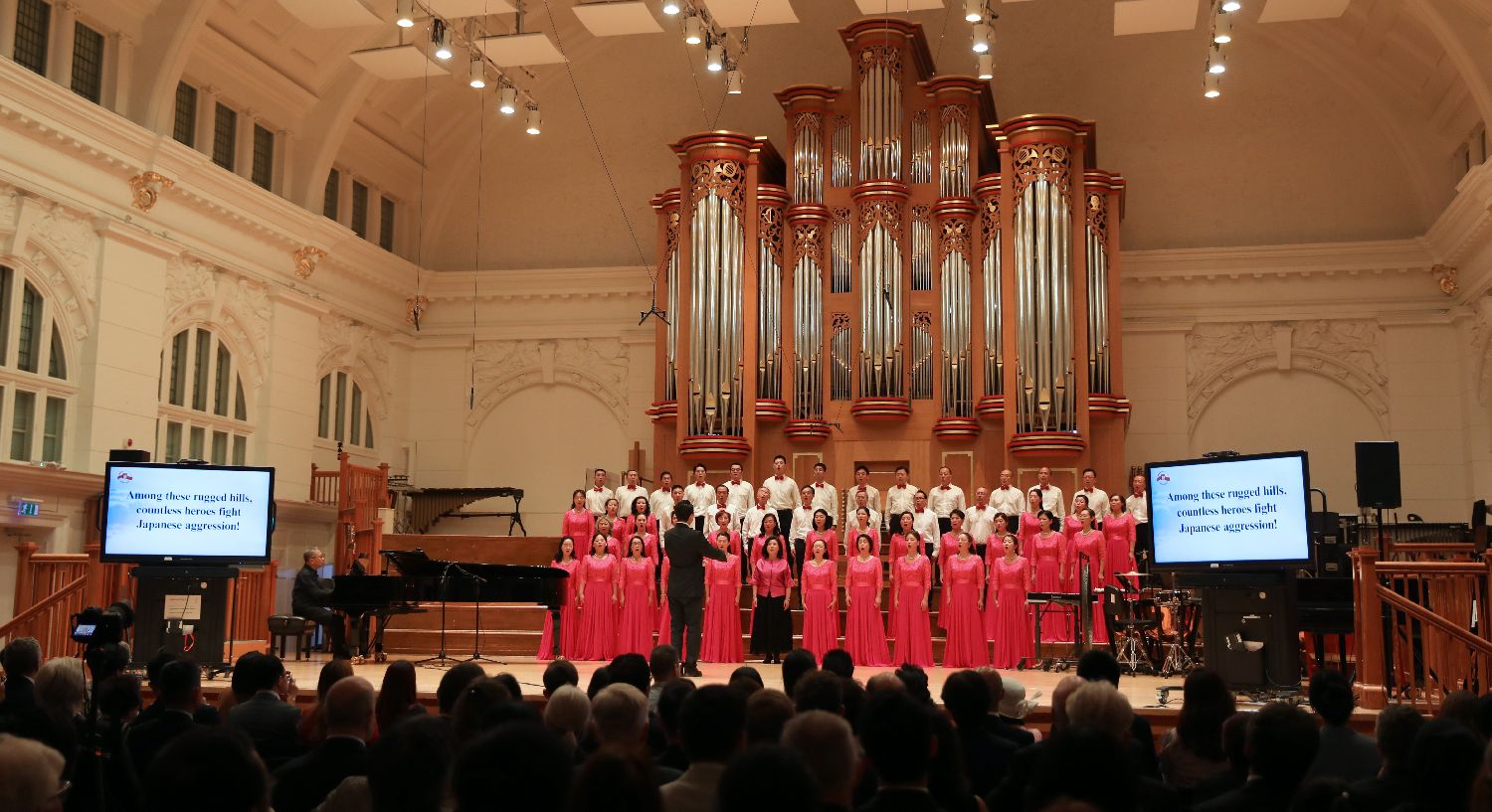 8月28日,演员在英国伦敦的“铭记历史·开创未来”主题音乐会上合唱《保卫黄河》。