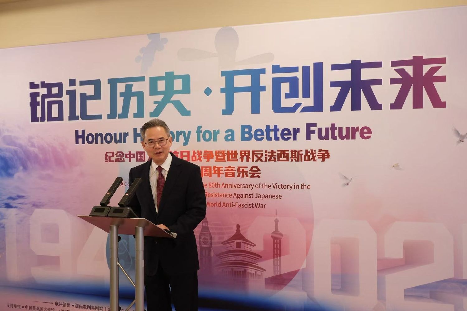 郑泽光在致辞中表示,80年前,中国人民经过浴血奋战,付出巨大民族牺牲,打败了日本军国主义侵略者。中英两国作为盟友并肩作战,为世界反法西斯战争胜利作出巨大贡献,并推动建立了以联合国为核心的国际体系。中国历来是一个爱好和平的国家。9月3日,中国将在北京举行盛大纪念活动,彰显走和平发展道路的坚定决心、捍卫国家主权和领土完整的坚强意志、维护世界和平安宁的强大能力。我们在伦敦举办此次专场音乐会,目的是用音乐铭记历史,缅怀为人类正义事业献身的先烈,展现对世界和平的珍爱,表达我们对推动构建人类命运共同体的坚定决心。
