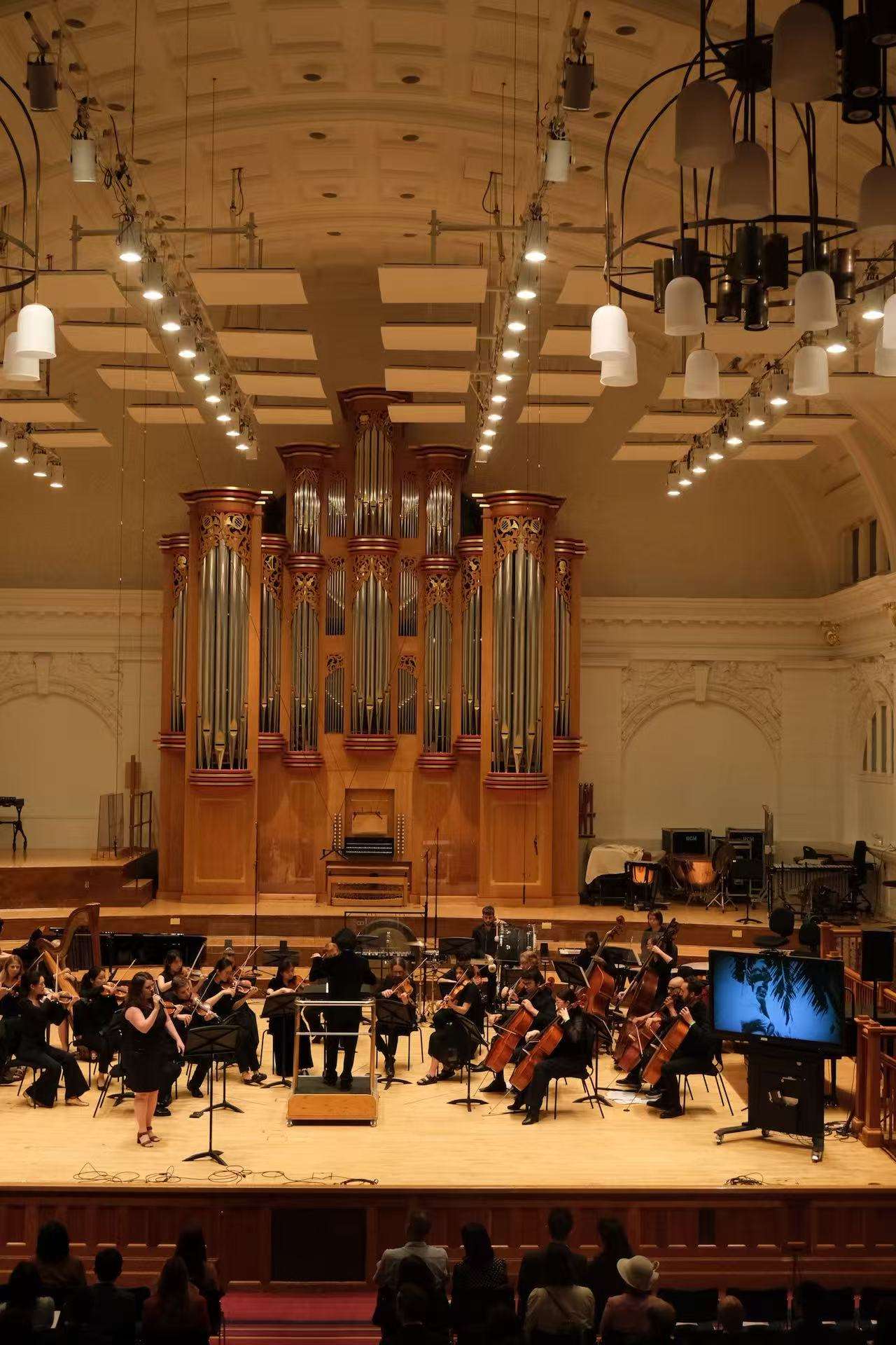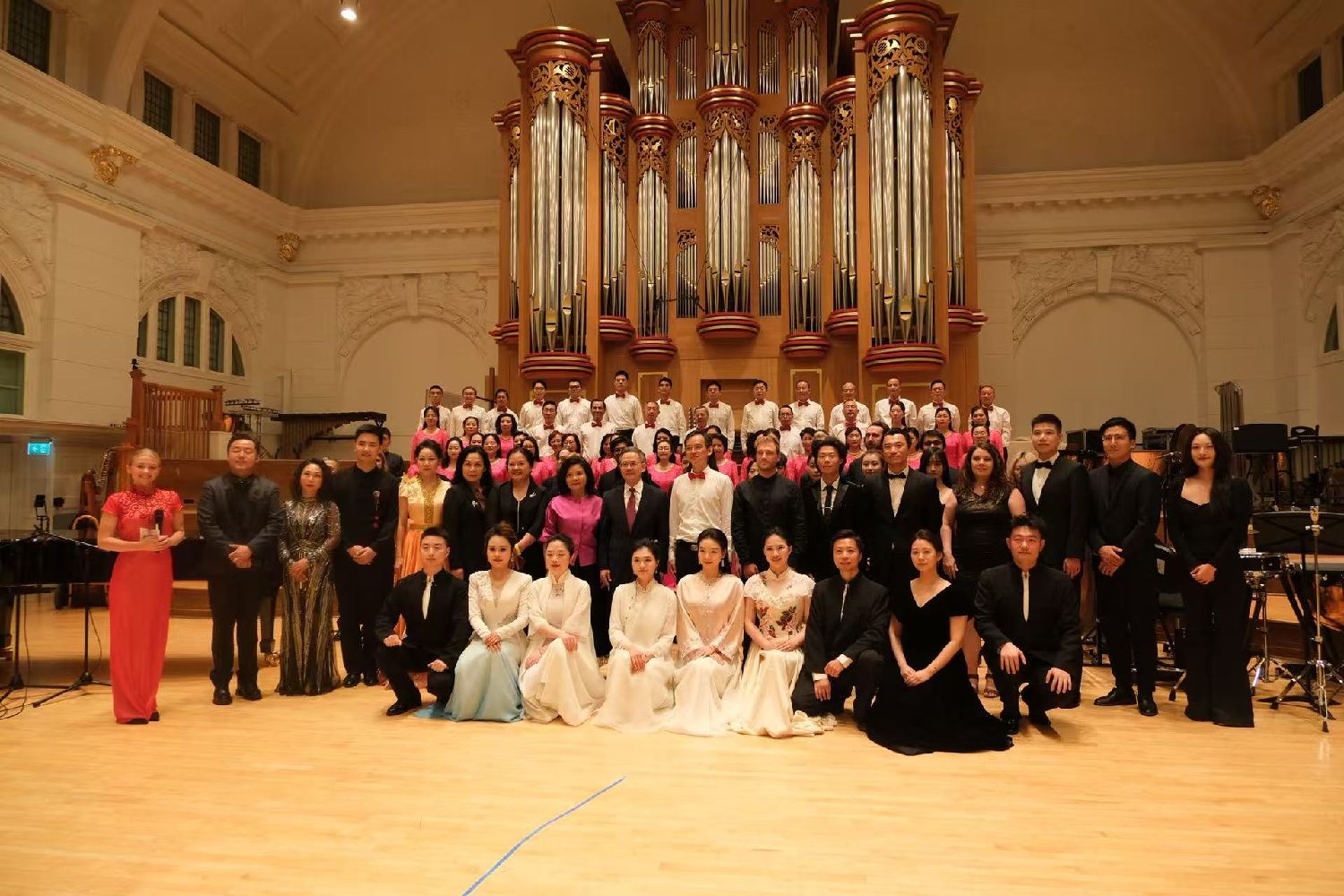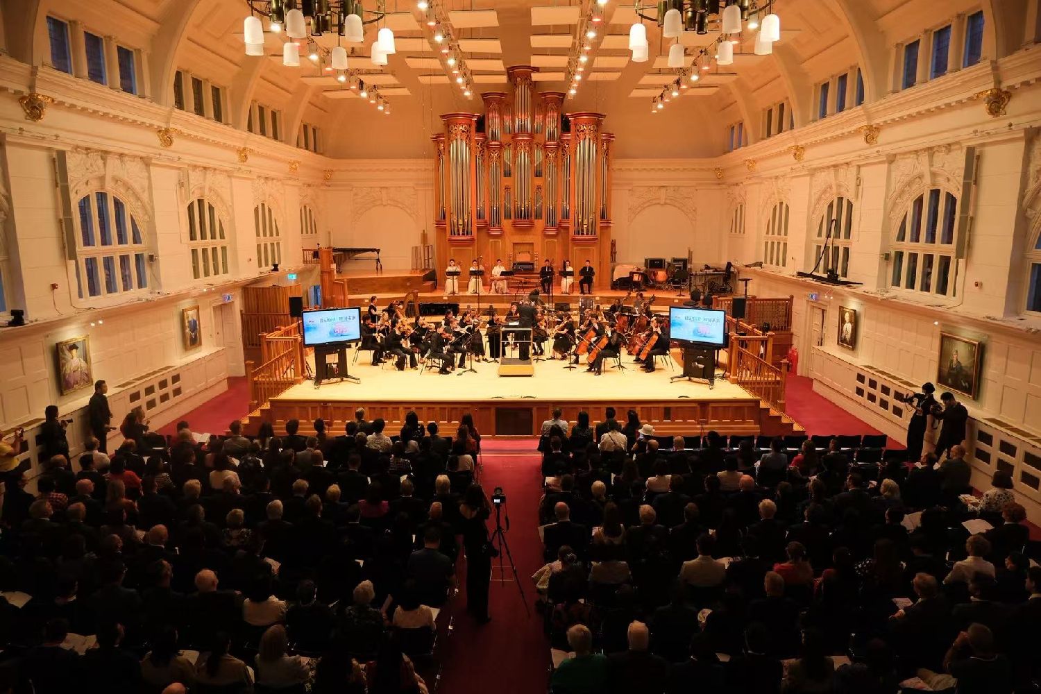 当晚,英国皇家音乐学院音乐厅灯火璀璨,现场气氛庄重热烈。音乐会以“铭记历史、开创未来”为主题,演出融合音乐、合唱、独唱、朗诵等多维度视听语言,中英两国乐团和艺术家们共奏文明交流互鉴乐章。一曲慷慨激昂的《红旗颂》拉开演出序幕。《尼姆洛德》《潇湘随想》等中英经典曲目,诉说各自民族精神,展现对和平的殷切向往。纪录片《里斯本丸沉没》插曲主唱现场演绎,用动人歌声礼赞浙江舟山渔民勇救“里斯本丸”号船英军战俘的感人义举。中国作曲家创作的交响曲《同舟》进行国外首演,传递同舟共济、共创未来的希望之声。华裔钢琴家肖荻精彩演绎的《黄河颂》,彰显中华民族不屈不挠的斗争精神。由中国驻英国大使馆合唱团、中国银行伦敦分行合唱团和伦敦华人爱乐合唱团联袂演绎的《保卫黄河》、《我的祖国》两首合唱歌曲将整场音乐会推向高潮,作品所展现的伟大抗战精神和浓厚家国情怀引发现场观众强烈共鸣,掌声、赞叹声经久不息。