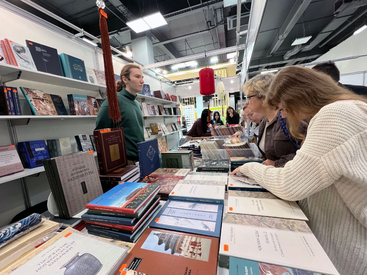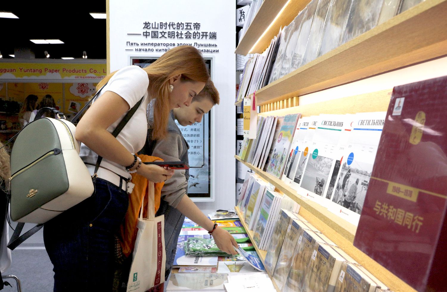 9月4日,读者在第38届莫斯科国际书展的尚斯国际出版集团展台挑选中国传统文化俄译本图书。