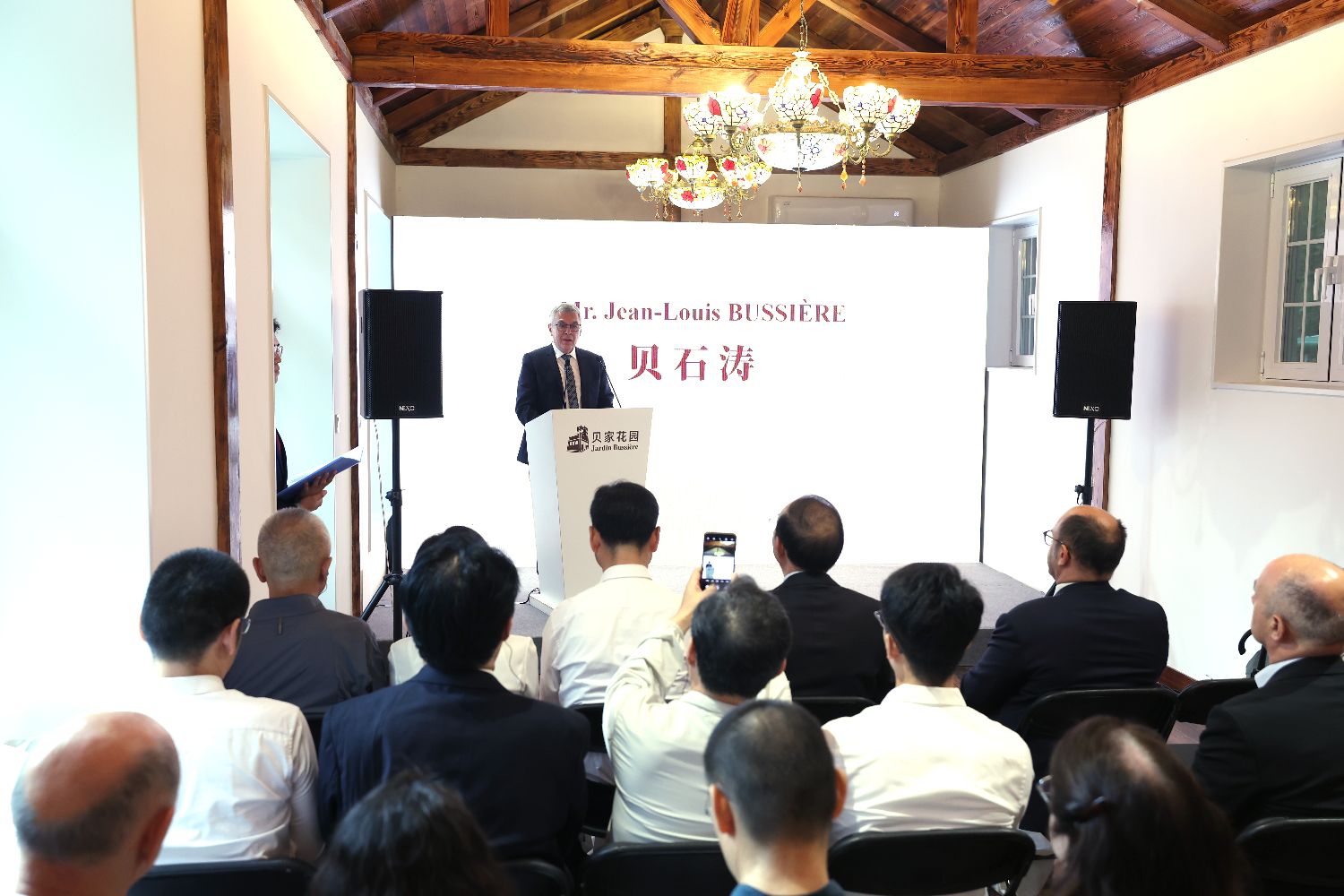 9月5日,“国际友谊的历史印记”主题展揭幕暨贝家花园重新开园仪式在北京海淀区贝家花园内举行。这座承载百年中法友好交往记忆的历史名园,经过精心修缮后,以崭新面貌重新对外开放。图为贝熙叶医生之子贝石涛致辞。(图片来源:本文图片均自中新社)