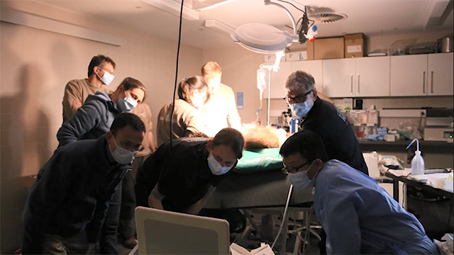 (希尔德布兰特教授与中国专家团队为大熊猫做超声检查)