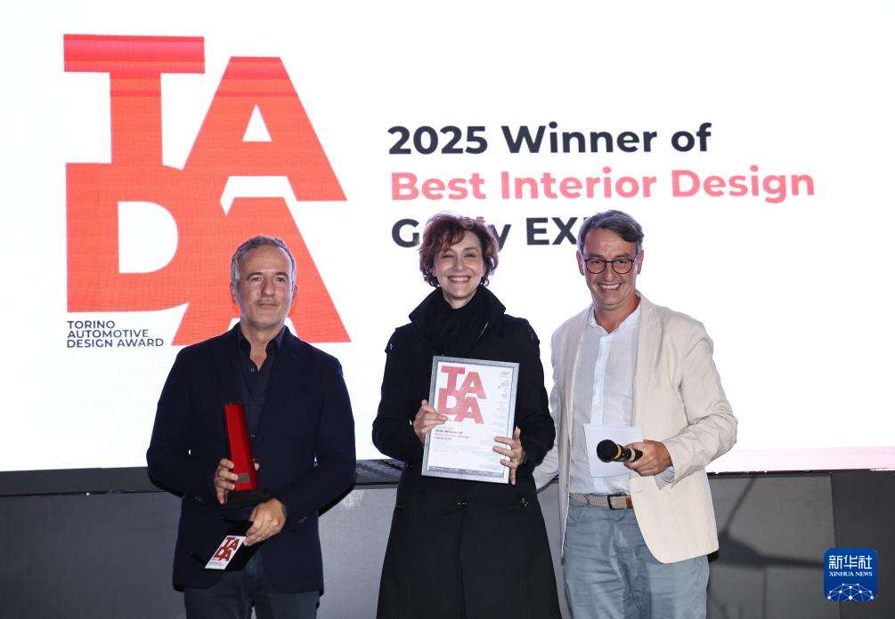 9月26日,在意大利都灵,荣获“都灵汽车设计奖”最佳内饰设计奖的吉利“银河E5”代表领奖。(图片来源:新华社)