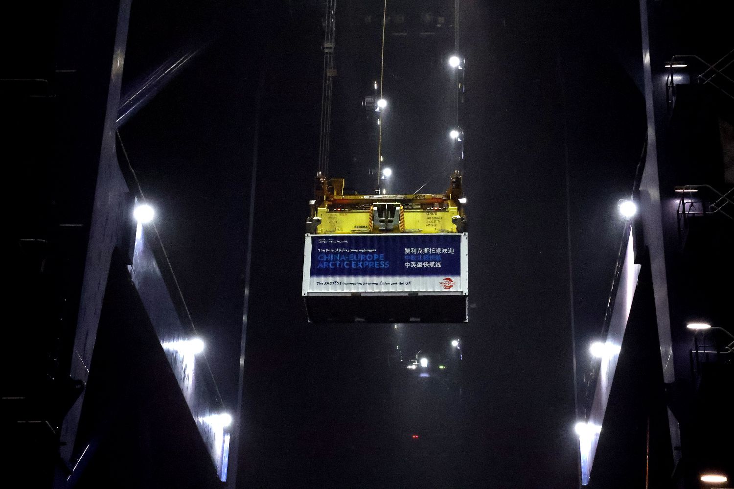 10月13日,在英国费利克斯托港,中欧北极快航航线首艘货船举行集装箱卸载仪式。历时20天,中欧北极集装箱快航航线首艘货船13日晚抵达英国费利克斯托港。