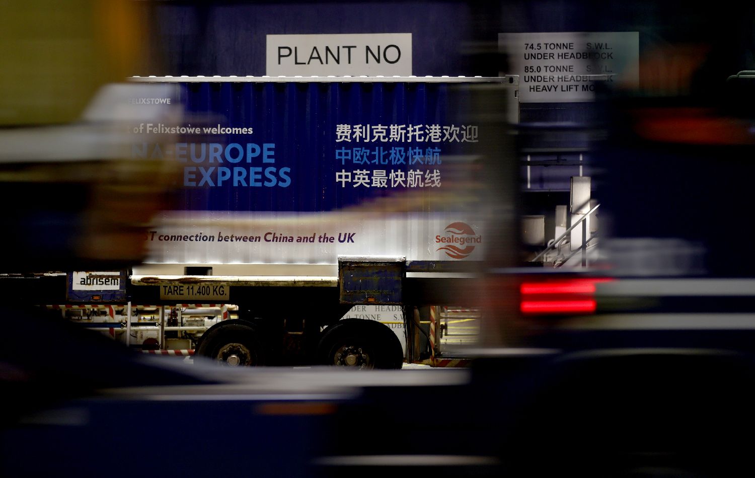 10月13日在英国费利克斯托港拍摄的印有“费利克斯托港欢迎中欧北极快航”字样的集装箱。