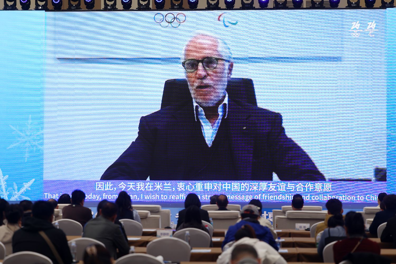 2025年10月16日,意大利奥委会主席、米兰冬奥会组委会主席乔瓦尼·马拉戈在活动现场视频致辞。(图片来源:本文图片均自李大鹏 摄)