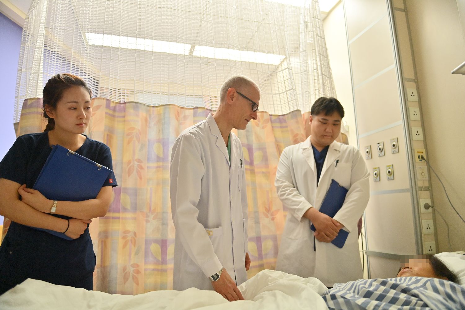 10月17日,吉林长春,拉瓦若(左二)带医生查房。(图片来源:中新社)