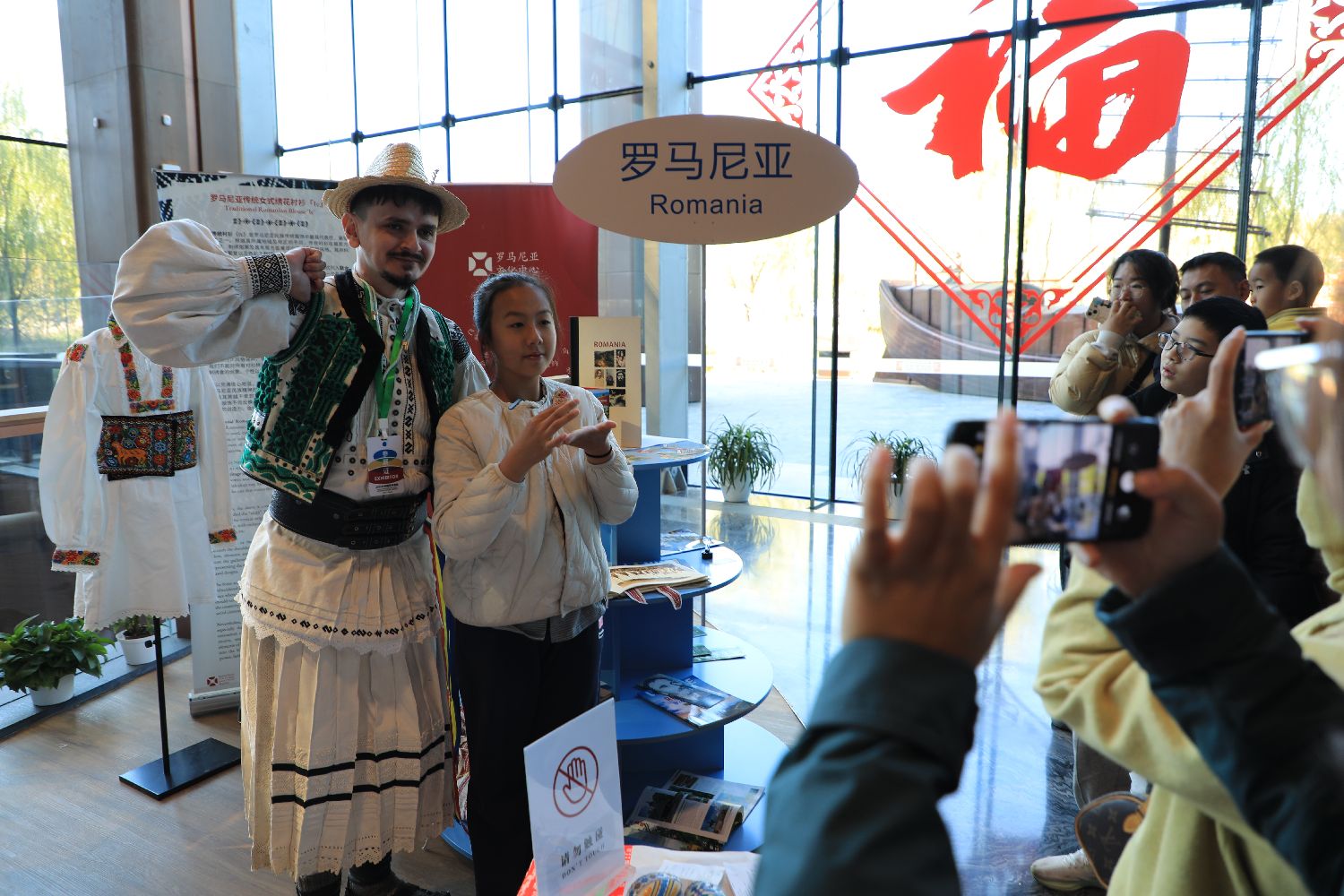2025年10月19日,参观者热情地与罗马尼亚艺术家合影。