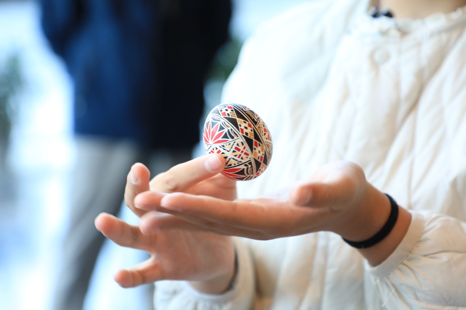 2025年10月19日,罗马尼亚彩蛋纹样精致、色彩艳丽,吸引参观者拿起观赏。