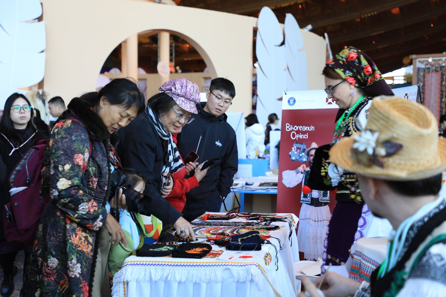 2025年10月19日,在罗马尼亚展台,参观者欣赏被联合国教科文组织列入非物质文化遗产名录的罗马尼亚传统衬衫。