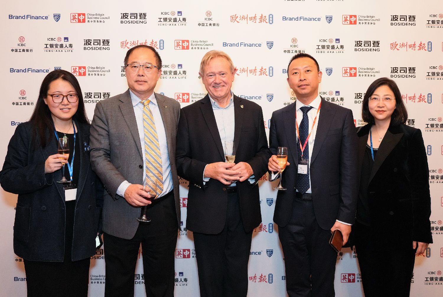 Brand Finance董事长兼首席执行官大卫·海格(中)、中国驻伦敦旅游办事处主任张力(左二)、欧洲时报英国分社总经理李强(右二)、英国分社副主编严振羽(右一)、文化中心主任刘玲妤(左一)在论坛招待会上合影。