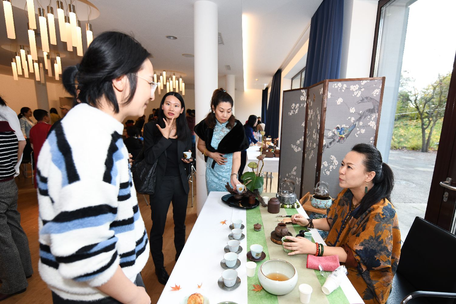 10月26日,在瑞士苏黎世州瓦利塞伦市,民众在展览上交流茶艺。当日,瑞士苏黎世中国传统文化协会在瓦利塞伦市举办“‘中国非物质文化遗产展’暨‘知行合一’——王阳明生平事迹图片展”。(图片来源:本文图片均自新华社)