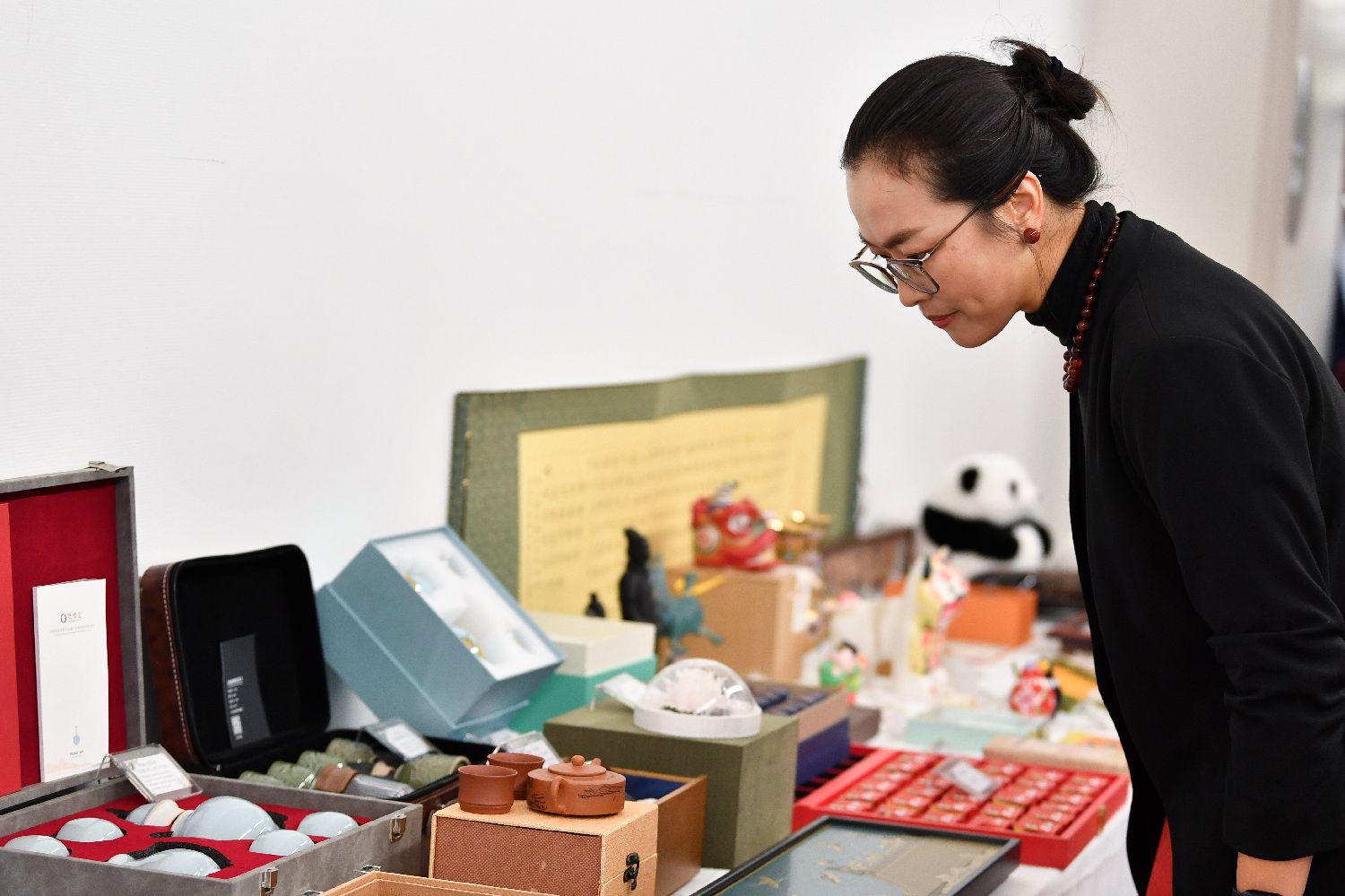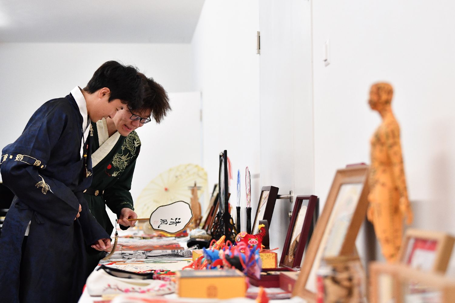 10月26日,在瑞士苏黎世州瓦利塞伦市,民众身着中国传统服饰参观展览。