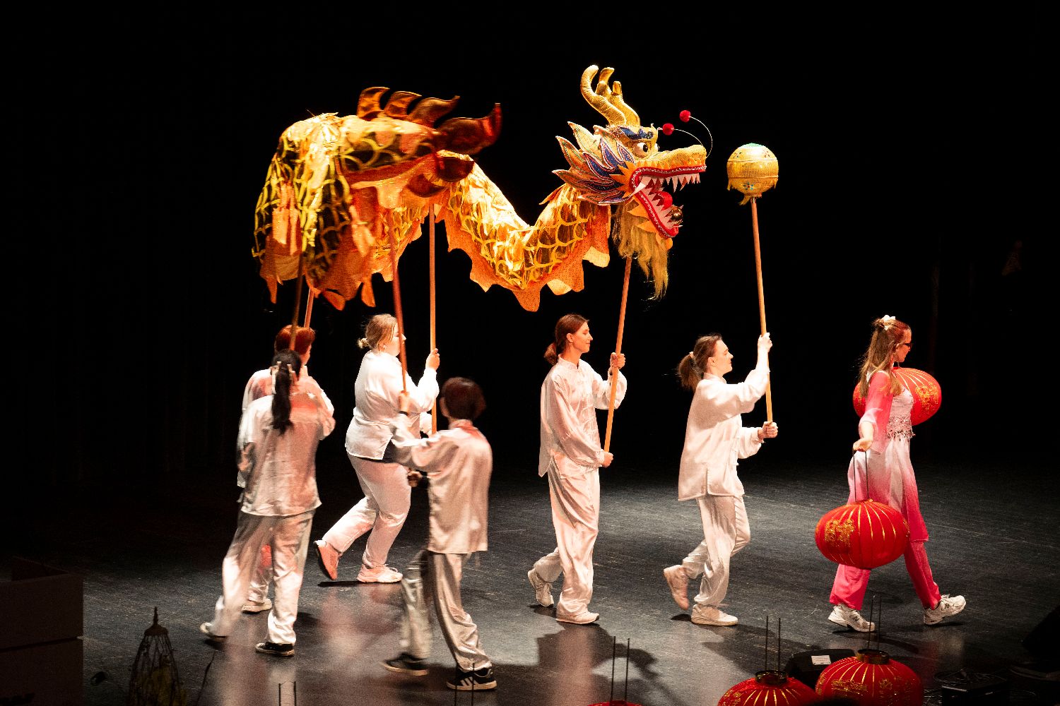 10月26日,在波兰格但斯克大学孔子学院,演员在庆祝活动上表演舞龙。(图片来源:新华社)