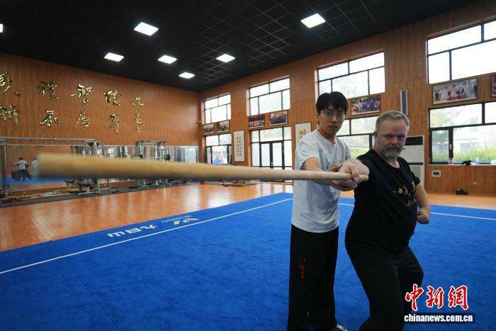 教练指导比利时八极拳爱好者练习八棍头棍术。