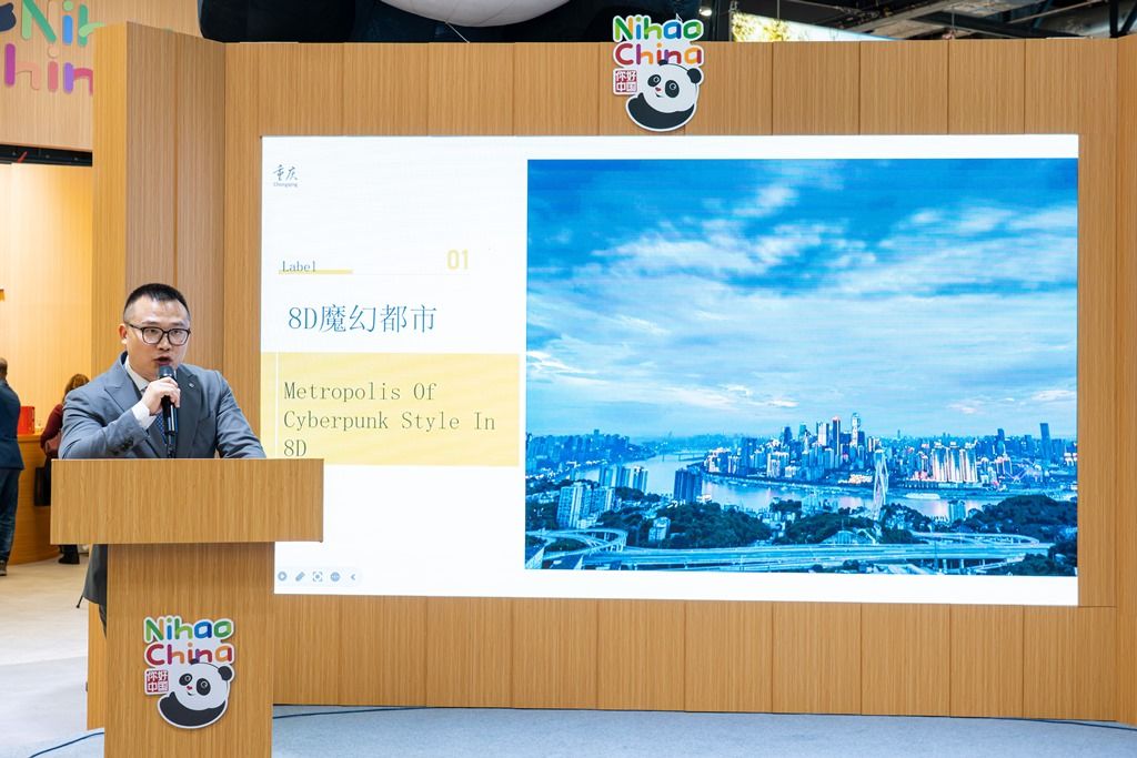 重庆文旅形象宣传片再现山嵌城郭、两江环绕的“立体8D魔幻”城市景观。洪崖洞、长江索道、李子坝单轨穿楼等的网红地标引得众多文旅业内参观者驻足。