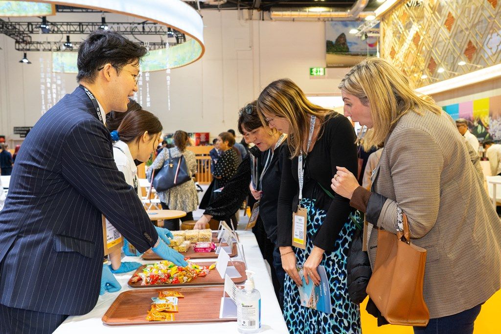 “渝味360碗”美食首次亮相国际知名旅展,展出江津米花糖、武隆羊角豆干、磁器口陈麻花等特色美食,吸引众多参会嘉宾驻足品尝。