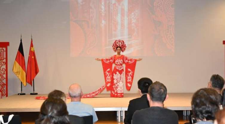 图为推介会现场剪纸服装秀。(图片来源:柏林中国文化中心供图)
