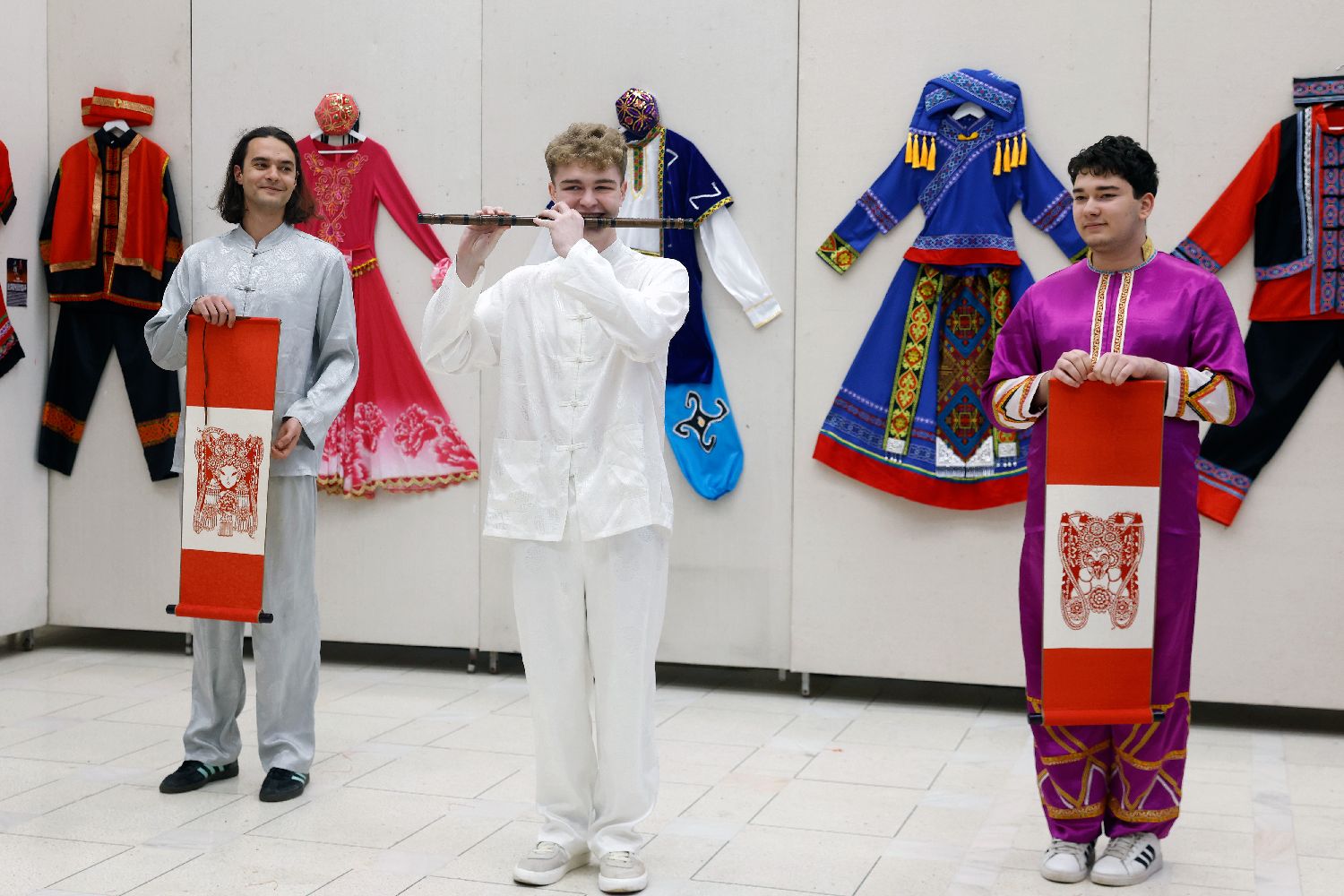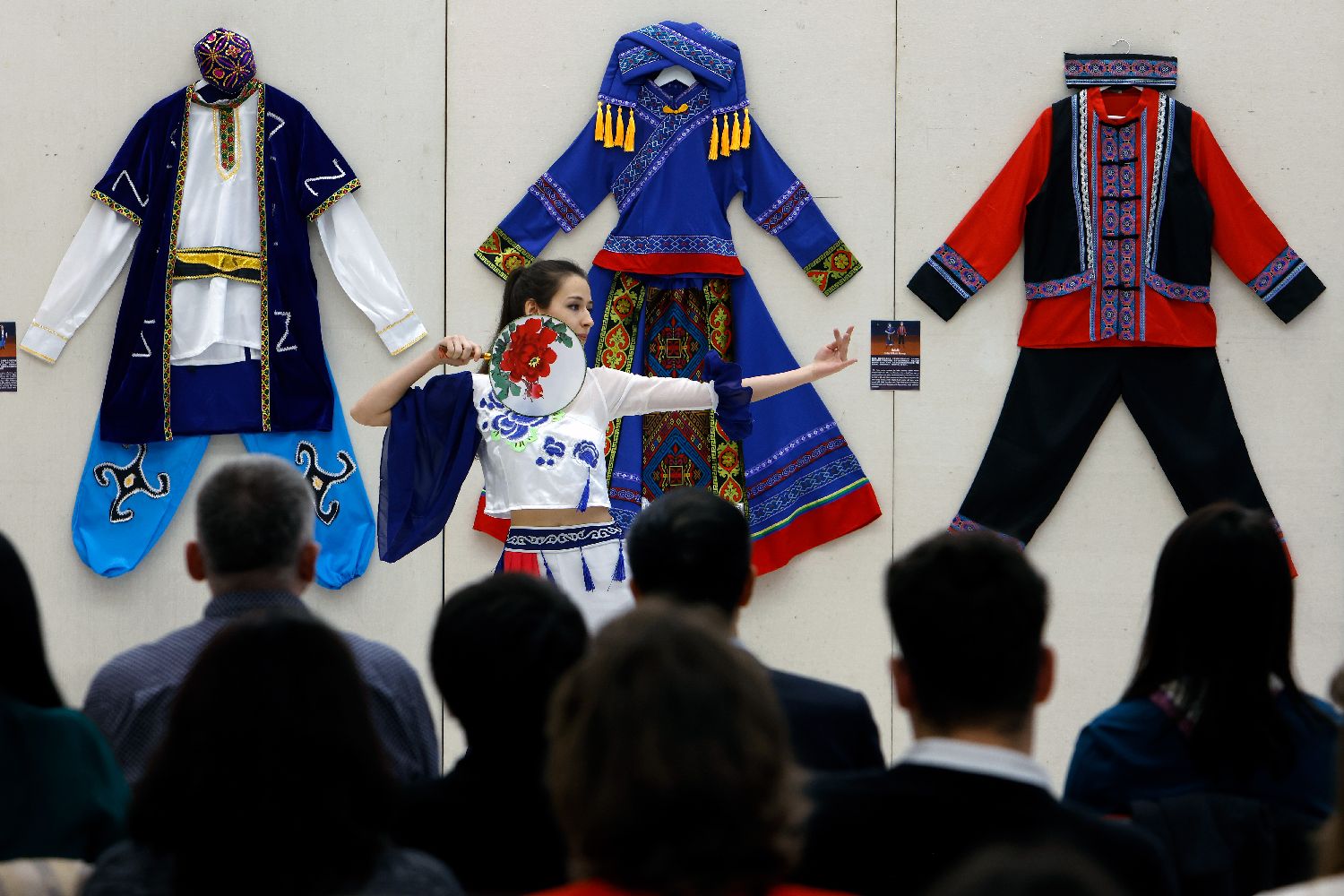 11月11日,在罗马尼亚布加勒斯特,布加勒斯特大学的学生在“霓裳锦韵——中国少数民族服饰展”开幕式上表演。(图片来源:本文图片均据新华社)