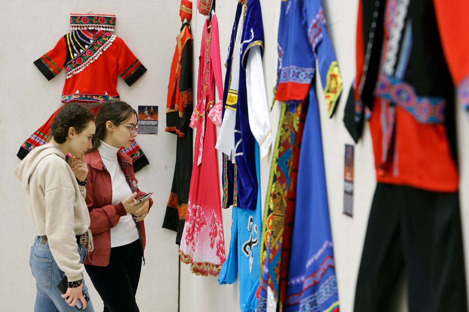 11月11日,在罗马尼亚布加勒斯特,观众参观“霓裳锦韵——中国少数民族服饰展”。