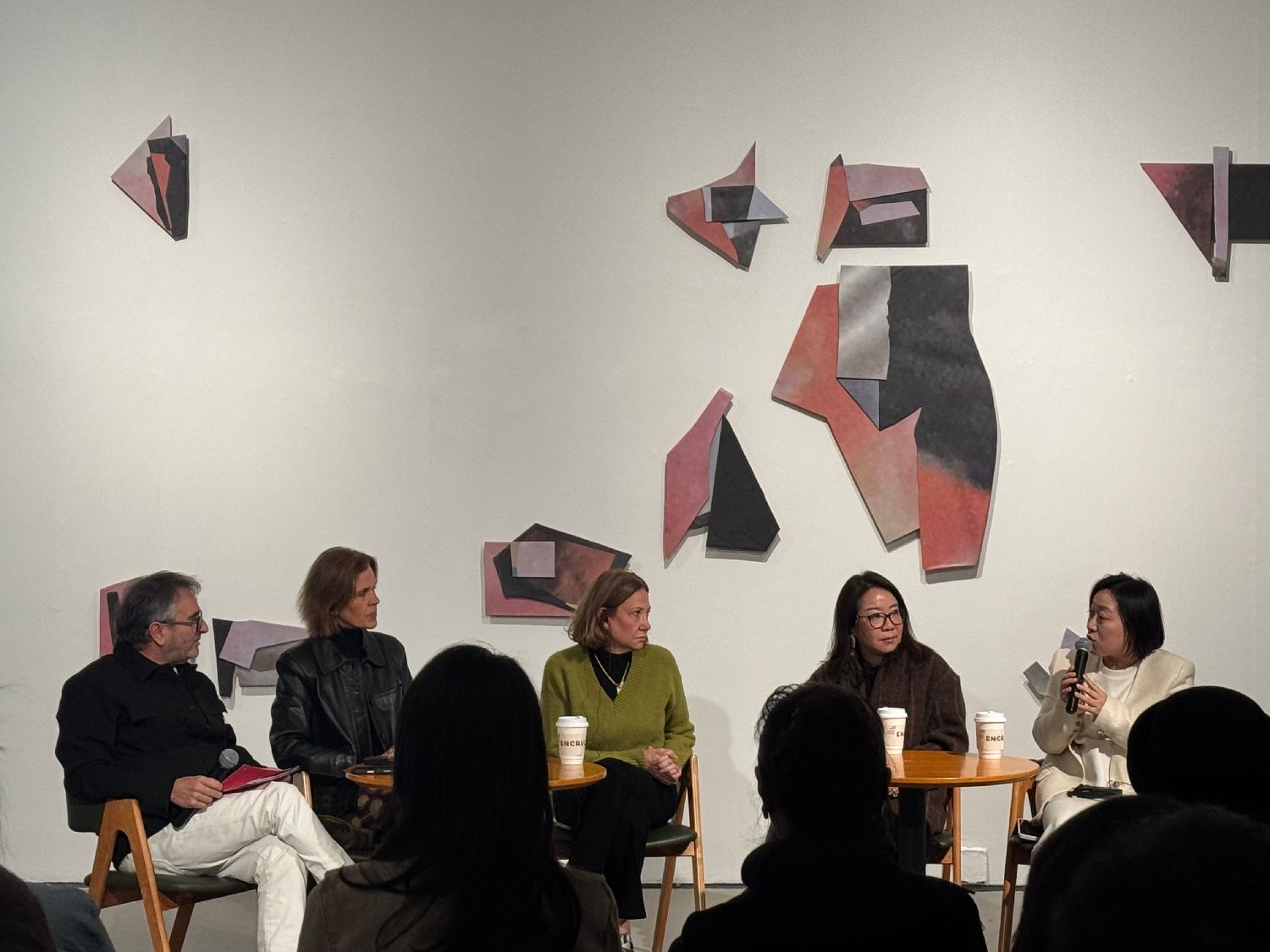 11月22日,“延迟的边界:中西女性艺术家与收藏家的对话”相关对谈活动在今日美术馆举行。图中人物自右向左分别为中国策展人晏燕、收藏家Coco Wang、西班牙收藏家Natalia Yera、策展人Lucía Ybarra及北京塞万提斯学院相关负责人。(朴落沐/摄)