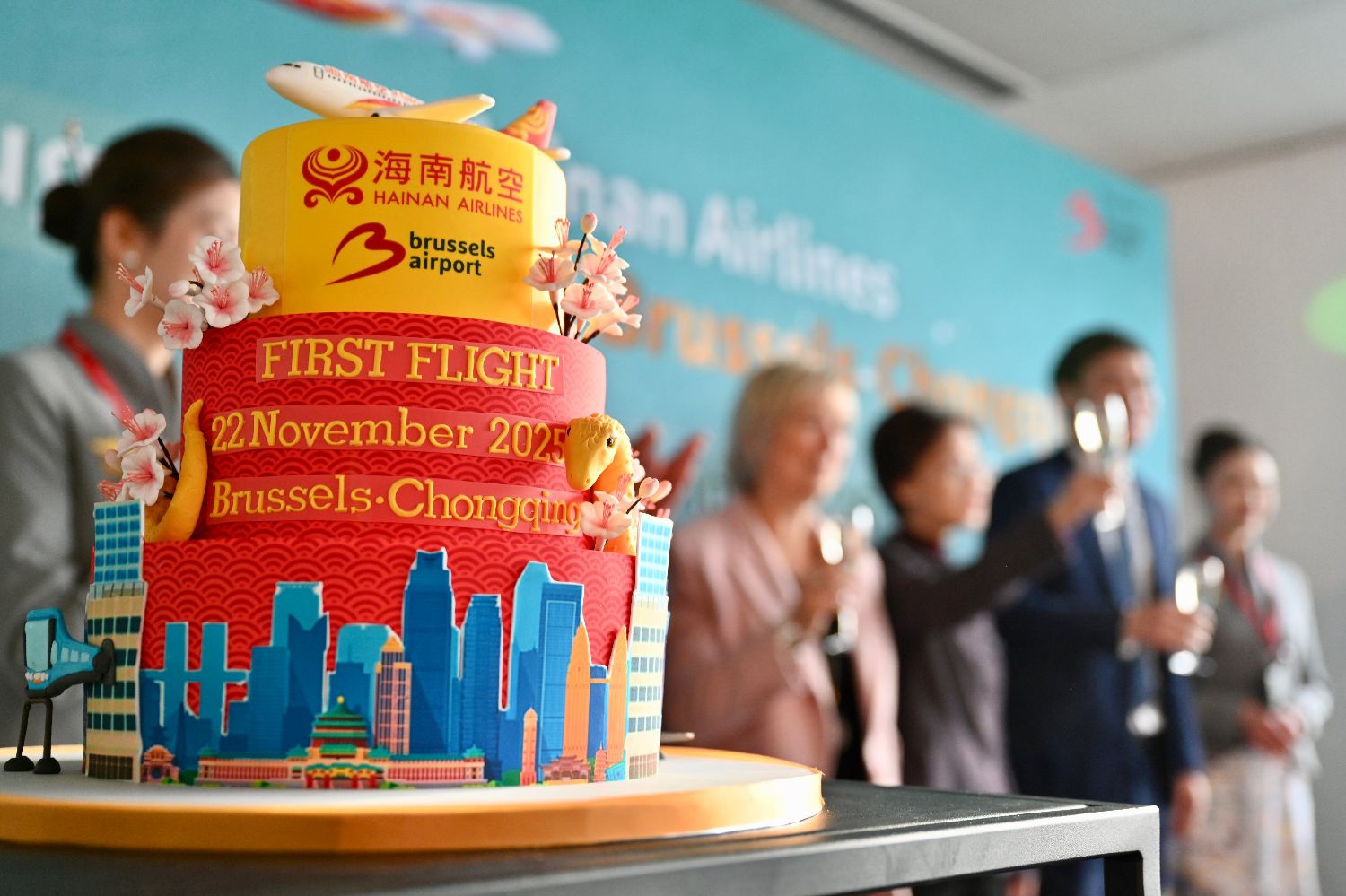 布鲁塞尔国际机场举行首航仪式,以车辆护送仪式欢送首个航班启程。图为11月22日在比利时布鲁塞尔国际机场举行的海南航空布鲁塞尔至重庆直飞航线首航仪式上拍摄的主题蛋糕。