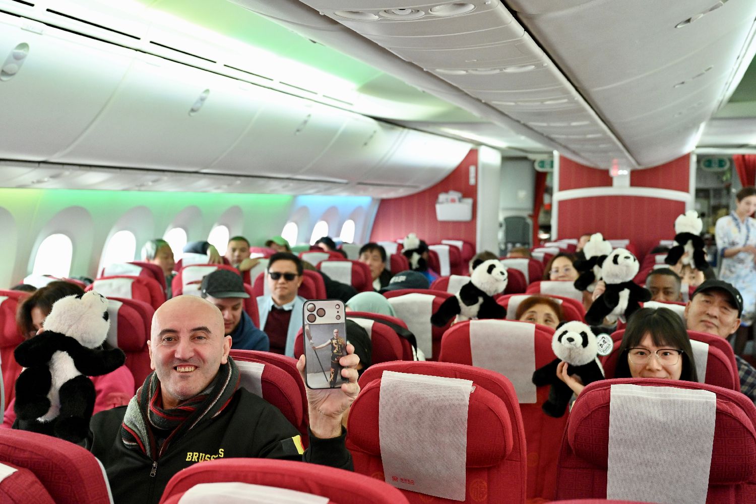 搭乘海南航空布鲁塞尔至重庆直飞航线首航航班的乘客在机舱内展示大熊猫玩偶。