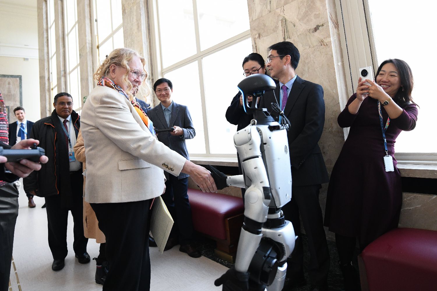 11月25日,在瑞士日内瓦万国宫,联合国日内瓦办事处总干事瓦罗瓦娅(前)在“人工智能 团结共治”高级别对话会前与机器人握手互动。(图片来源:新华社)