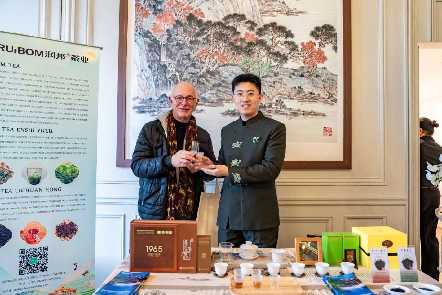 茶和天下,凡有茶的地方,便有对话在杯盏间开始。一片小小茶叶的蜕变,需经青、蒸青、揉捻等9道工序。干茶翠绿、汤色青绿、叶底嫩绿,恩施玉露非遗传承人、恩施市润邦国际富硒茶业有限公司副总经理张闰宇现场展示的恩施玉露,让一众外国嘉宾产生了浓厚的兴趣。“Cin Cin(干杯)”“请请”来自法国的迪米特里夫妇,对中国茶非常喜爱,他们喝完一杯恩施玉露又续上一杯。
