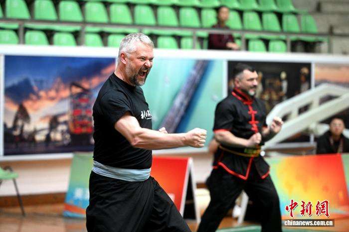 11月22日,英国“洋弟子”丹尼尔(左)在2025年“永春功夫杯”武术邀请赛境外组男子中年组永春白鹤拳项目的比赛现场。(图片来源:中新网)