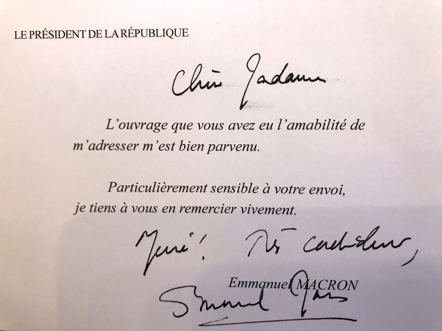 法国马克龙于2024年在收到《穿越诗歌的星空:60位中法诗人双语诗选》后给张如凌的感谢信。(图片来源:张如凌供图)