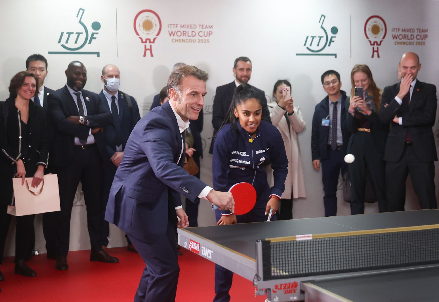 12月5日,法国总统马克龙前往四川省体育馆,与正在成都参加2025年国际乒联混合团体世界杯的中法两国运动员互动。(图片来源:新华社)