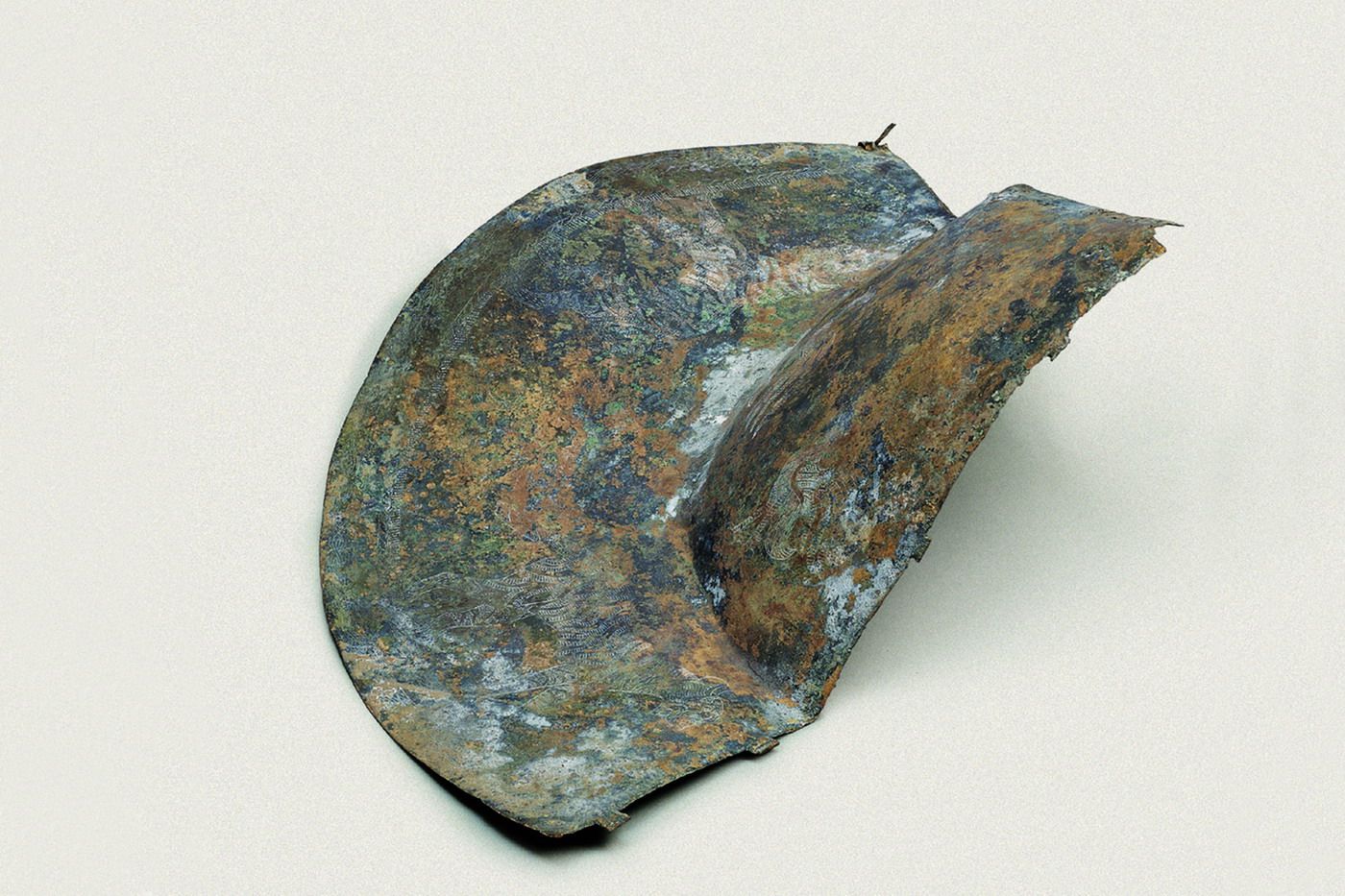 这件西汉时期的青铜头盔残件便是出土于羊甫头墓地。发掘报告称,其“似帽形扇面,有榫眼及扣,后端似其他材料制成,已朽无存。面阴刻两鸡两虎,沿刻陶纹。扇面宽40.4厘米”。乍看之下,它只是众多青铜器中普通的一件;但仔细看来,这顶头盔却有着希腊文化的一些特征,在已出土的上万件滇国青铜器中形制独特。