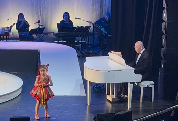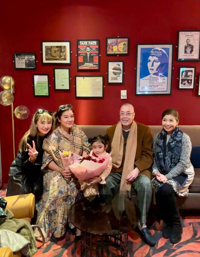 著名钢琴家刘诗昆(右二)和太太孙颖(左二)飞抵伦敦,支持女儿刘蓓蓓的演出。音乐剧《哪吒》首演最后一场演出谢幕时,刘诗昆惊喜上台,为中外观众演奏了《哪吒》《黄河》选段,女儿蓓蓓翩翩起舞,父女同台演出了。