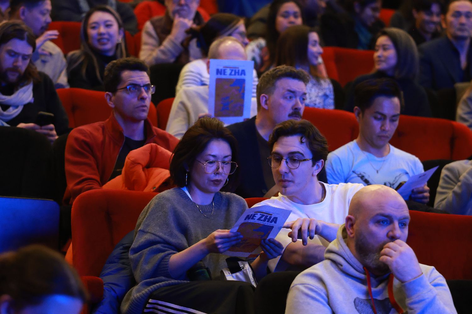 1月8日,伦敦萧剧场内观众在看音乐剧《哪吒》海报。