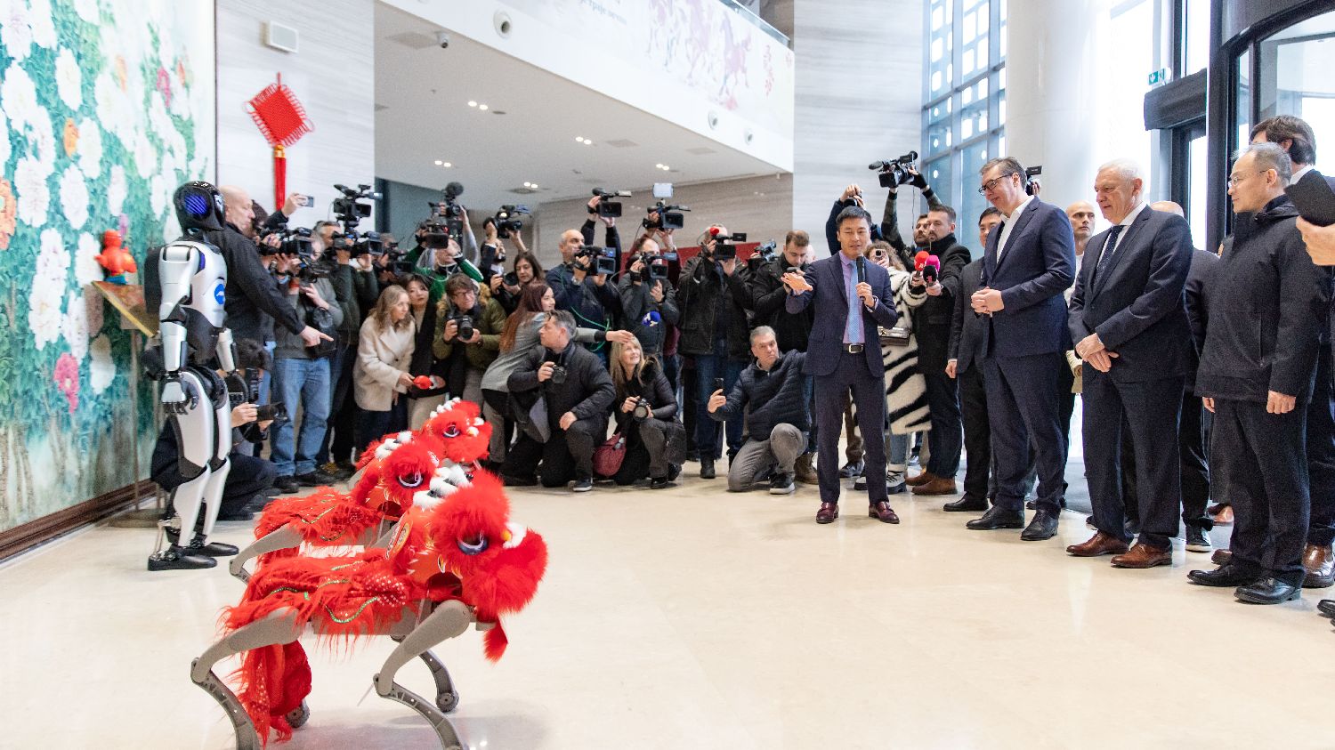 2月2日,在塞尔维亚首都贝尔格莱德的中国文化中心,塞尔维亚总统武契奇(前右三)听取对一款机器人的介绍。