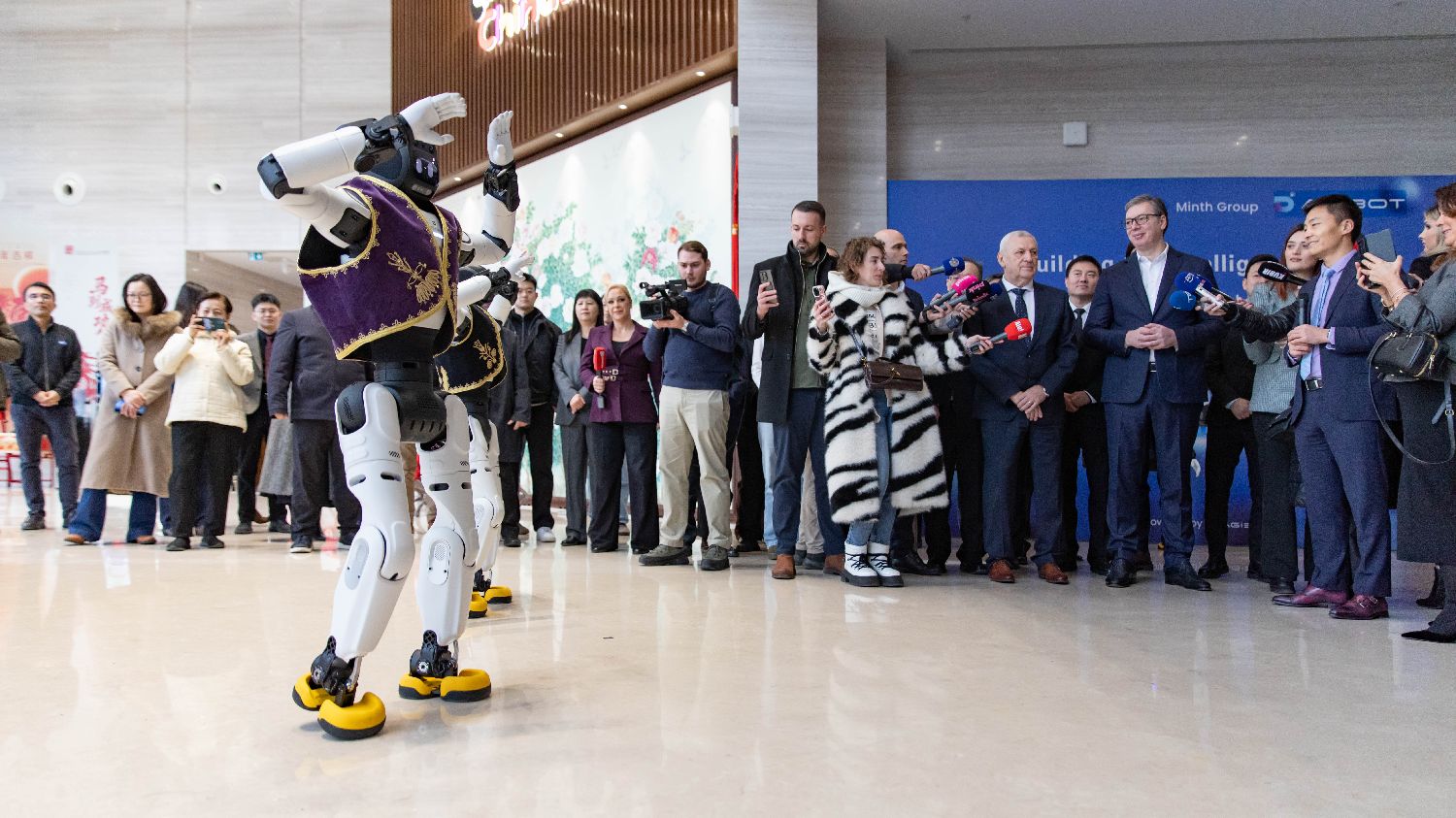2月2日,在塞尔维亚首都贝尔格莱德的中国文化中心,身着塞尔维亚传统服饰的机器人表演舞蹈。