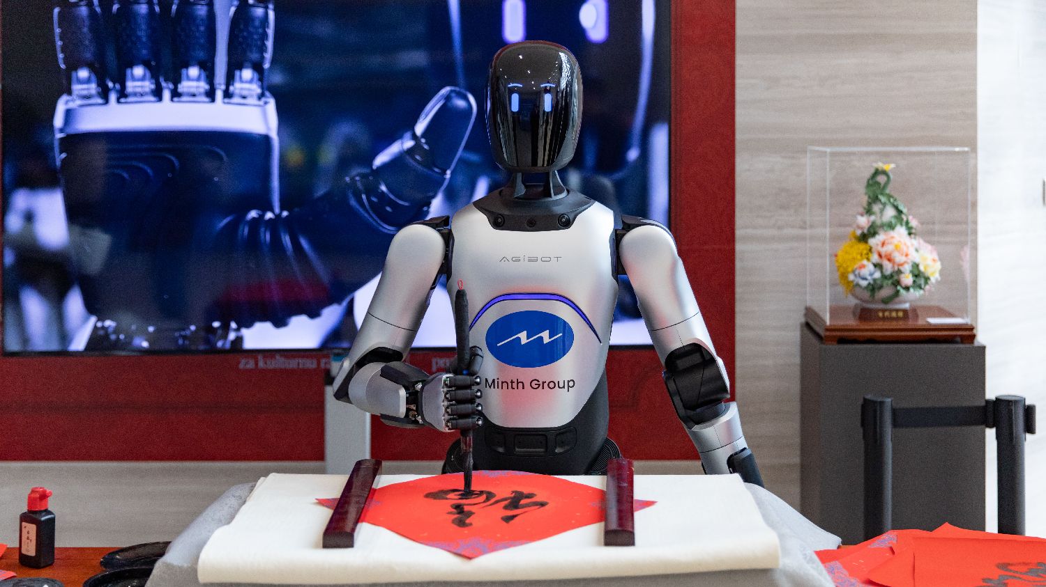 2月2日,在塞尔维亚首都贝尔格莱德的中国文化中心,一款机器人使用毛笔书写“福”字。